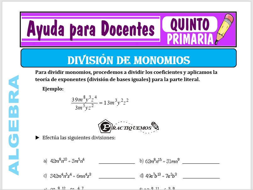 Aquí tendrás una ficha de División de Monomios para Quinto de Primaria o estudiantes que tengan 10 años de edad, esta ficha se ha desarrollado para el curso de Algebra.