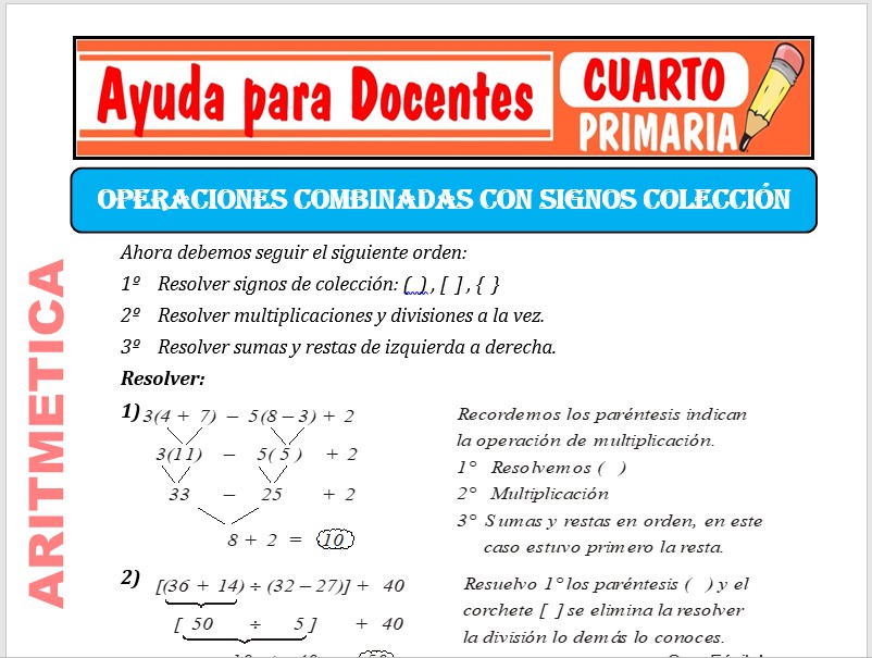 Aquí podrás obtener varias fichas de Operaciones Combinadas con Signos de Colección para Cuarto de Primaria o estudiantes que tengan 09 años de edad, esta ficha está preparada para el curso de Aritmética.