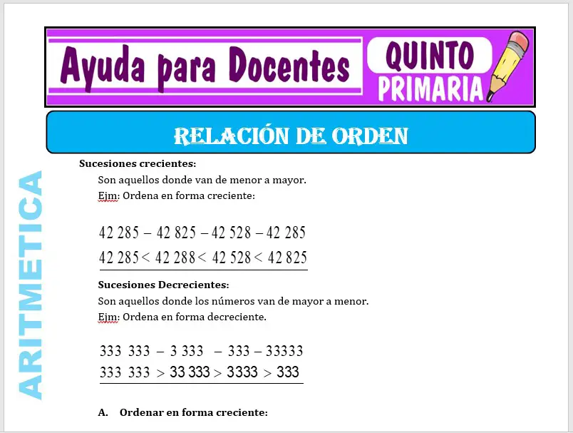 Aquí tendrás una ficha de Actividades de Relación de Orden para Quinto de Primaria o estudiantes que tengan 10 años de edad, esta ficha se ha desarrollado para el curso de Aritmética.