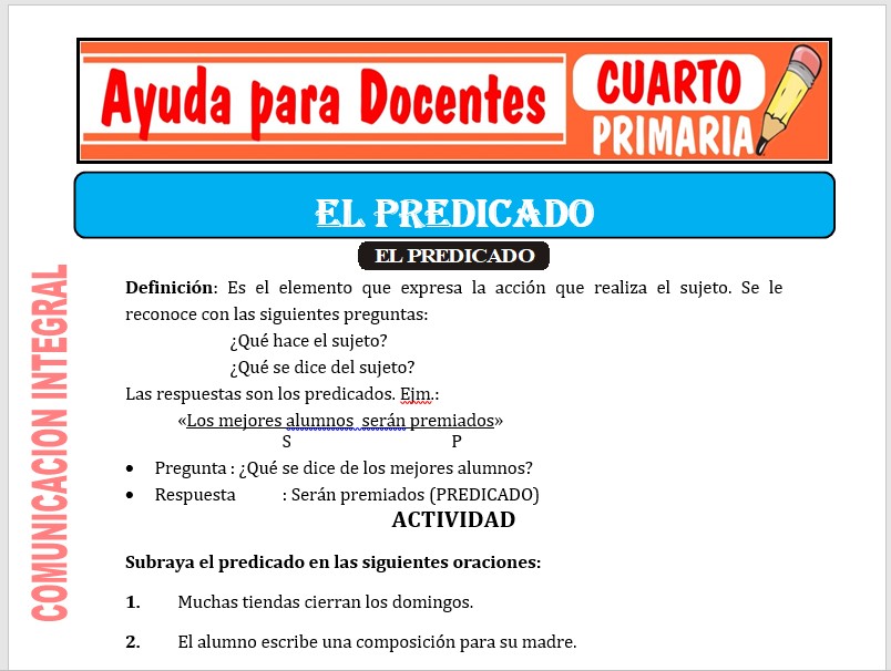 Aquí podrás obtener varias fichas de El Predicado para Cuarto de Primaria o estudiantes que tengan 09 años de edad, esta ficha esta preparada para el curso de Comunicación Integral.