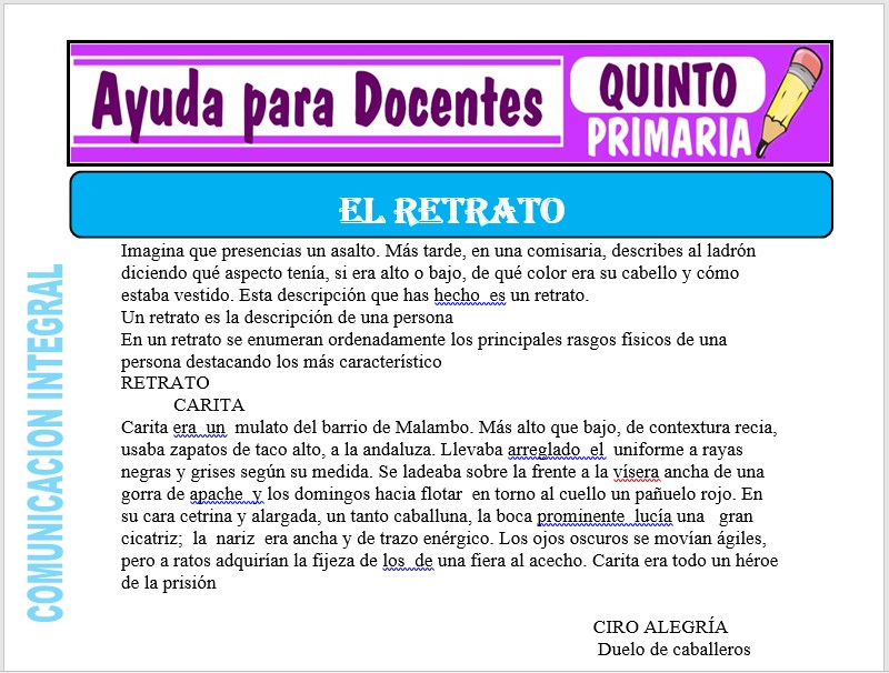 Aquí tendrás una ficha de Actividades del Retrato para Quinto de Primaria o estudiantes que tengan 10 años de edad, esta ficha se ha desarrollado para el curso de Comunicación Integral.