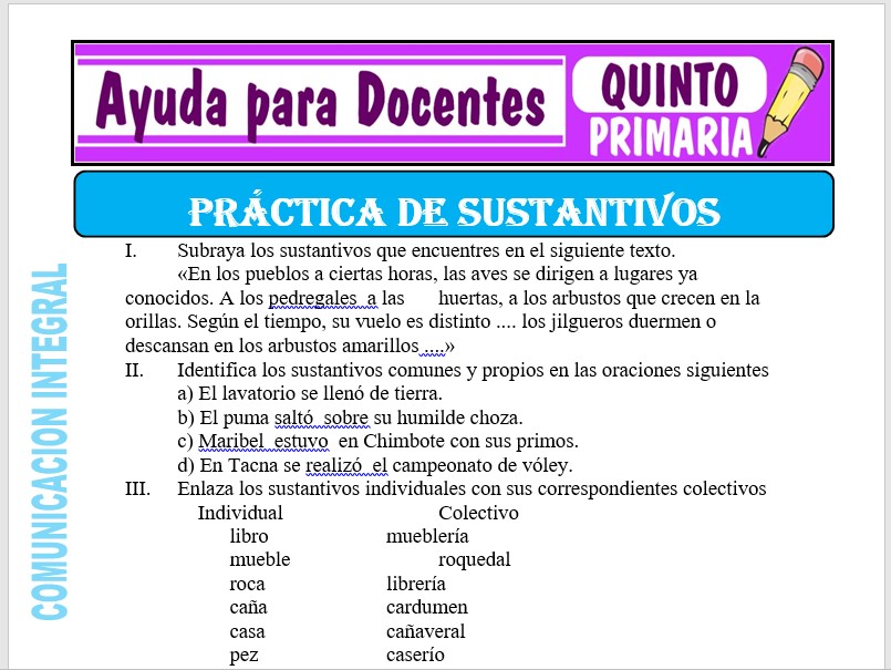 Practica de los Sustantivos para Quinto de Primaria