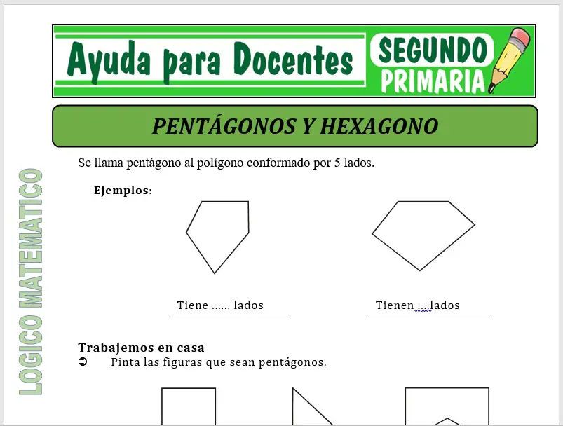 Aquí encontrarás una ficha de Pentágono y Hexágono para Segundo de Primaria o alumnos que tengan 07 años, que ha sido creado especialmente para el curso de Lógico Matemático.