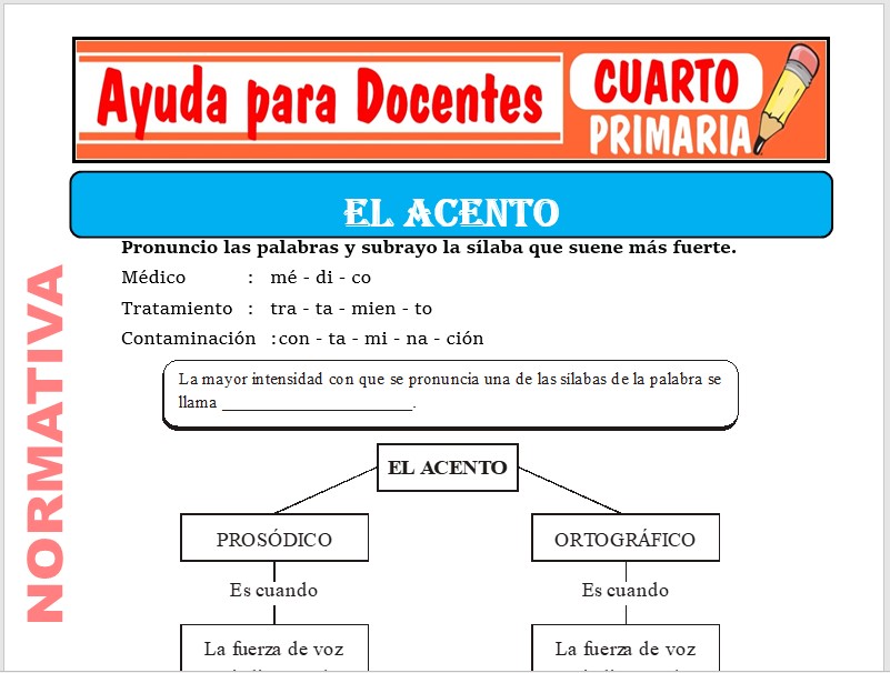 Aquí podrás obtener varias fichas de El Acento para Cuarto de Primaria o estudiantes que tengan 09 años de edad, esta ficha está preparada para el curso de Normativa.
