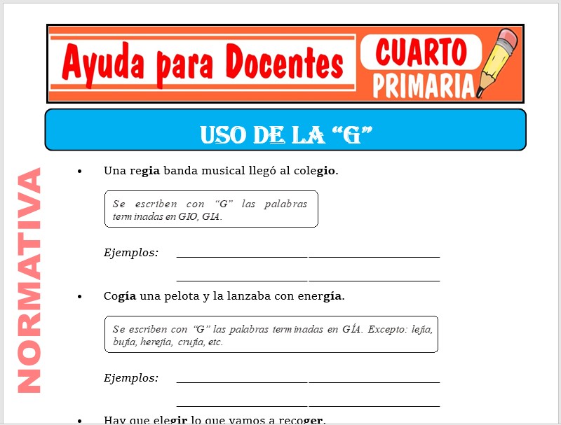 Aquí podrás obtener varias fichas de Escribimos con la “G” para Cuarto de Primaria o estudiantes que tengan 09 años de edad, esta ficha está preparada para el curso de Normativa.