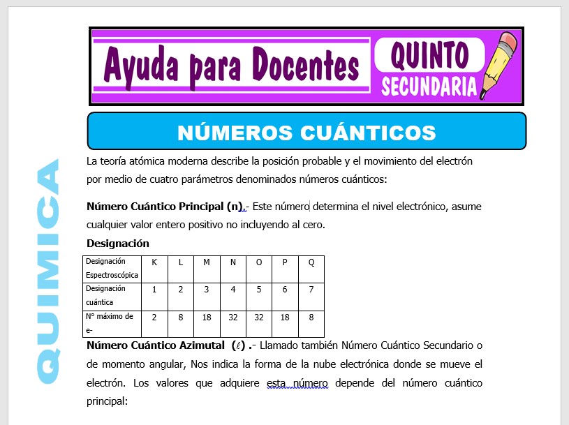 Aquí adquirirás una ficha de Números Cuánticos para Quinto de Secundaria o alumnos que tengan 15 años, esta ficha se diseñado para el curso de Química.