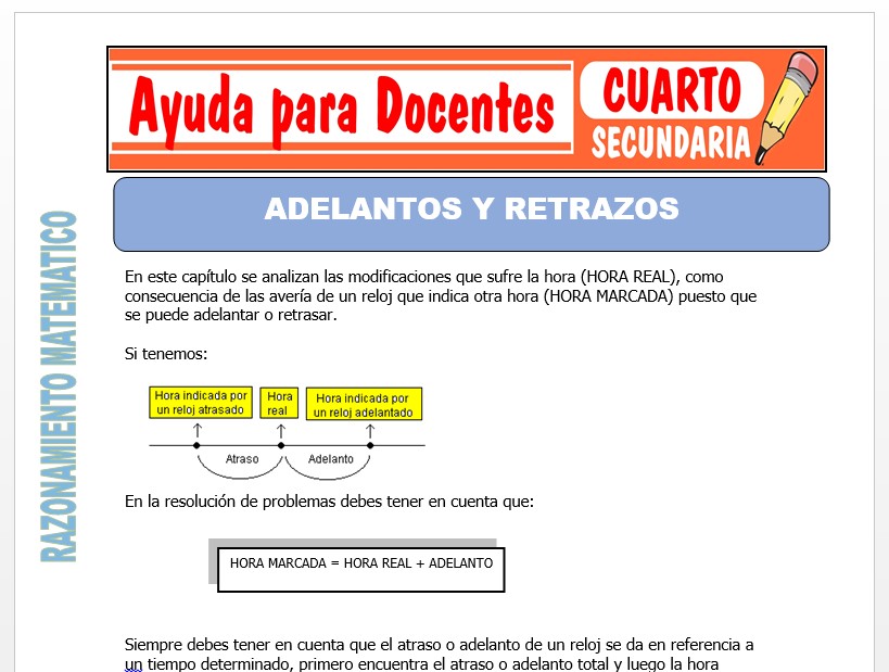 En este material educativo de Razonamiento Matemático veras algunos conceptos y actividades muy importantes sobre Adelantos y Retrasos, ahora veras parte de su contenido: