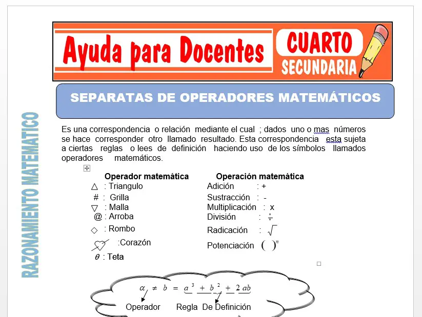 Aquí recibirás una ficha de Separatas de Operadores Matemáticos para Cuarto de Secundaria o alumnos que tengan 14 años, esta ficha se preparó para el curso de Razonamiento Matemático.