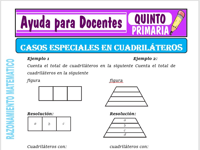 Aquí tendrás una ficha de Casos Especiales en Cuadriláteros para Quinto de Primaria o estudiantes que tengan 10 años de edad, esta ficha se ha desarrollado para el curso de Razonamiento Matemático.
