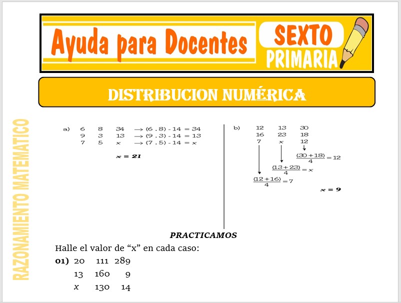 Aquí podrás adquirir fichas de La Distribución Numérica para Sexto de Primaria o estudiantes que tengan 11 años de edad, esta ficha se ha dedicado y trabajado para el curso de Razonamiento Matemático.