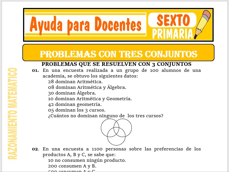 Aquí podrás adquirir fichas de Problemas con tres Conjuntos para Sexto de Primaria o estudiantes que tengan 11 años de edad, esta ficha se ha dedicado y trabajado para el curso de Razonamiento Matemático.