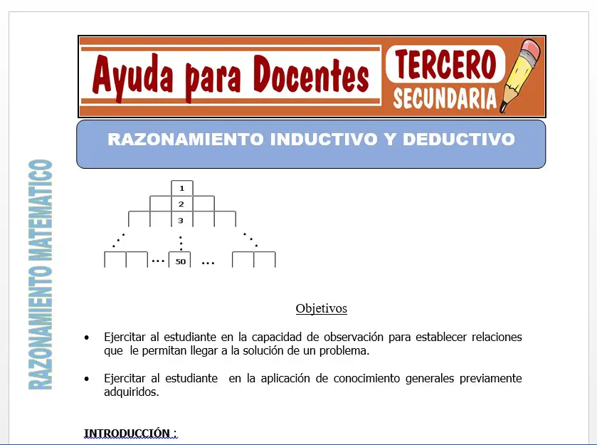 Aquí adquirirás una ficha de Razonamiento Inductivo y Deductivo para Tercero de Secundaria o alumnos que tengan 13 años, esta ficha se creó para el curso de Razonamiento Matemático.