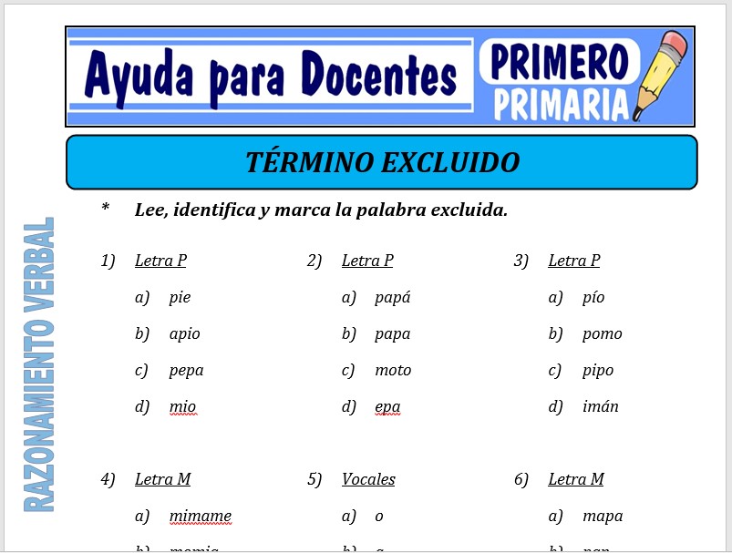 Aquí hallaras una ficha de Termino Excluido para Primero de Primaria o alumnos que tengan 06 años, esta ficha se creado especialmente para el curso de Razonamiento Verbal.