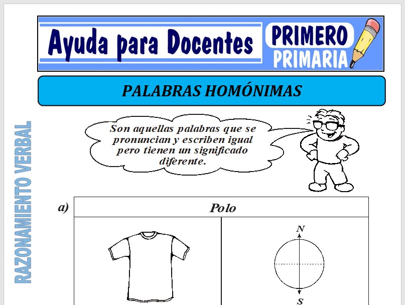 Aquí hallaras una ficha de Palabras Homónimas para Primero de Primaria o alumnos que tengan 06 años, esta ficha se creado especialmente para el curso de Razonamiento Verbal.