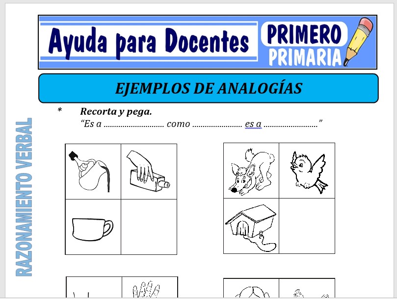 Aquí hallaras una ficha de Ejemplos de Analogías para Primero de Primaria o alumnos que tengan 06 años, esta ficha se creado especialmente para el curso de Razonamiento Verbal.