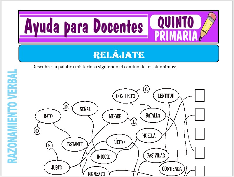 Aquí tendrás una ficha de Relájate para Quinto de Primaria o estudiantes que tengan 10 años de edad, esta ficha se ha desarrollado para el curso de Razonamiento Verbal.