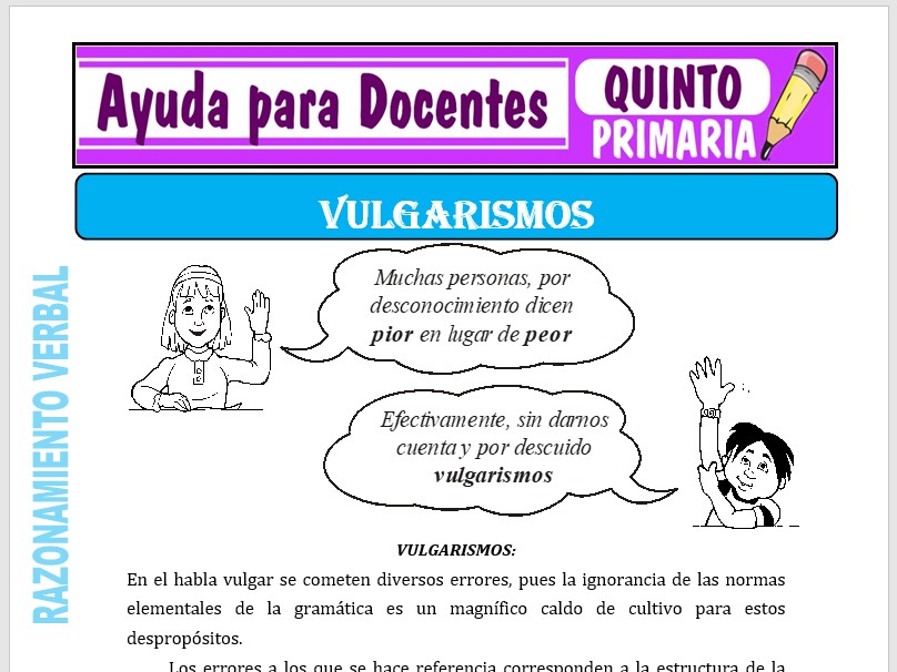 Aquí tendrás una ficha de Vulgarismos para Quinto de Primaria o estudiantes que tengan 10 años de edad, esta ficha se ha desarrollado para el curso de Razonamiento Verbal.