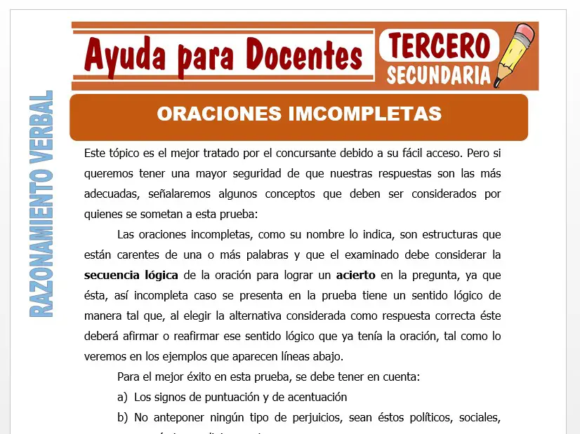 En esta ficha educativa de Razonamiento Verbal hallaras algunos conceptos y actividades muy importantes sobre Separatas de Oraciones Incompletas, ahora mostraremos parte de su contenido: