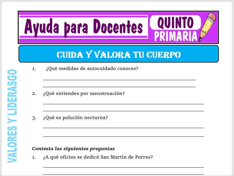 Aquí tendrás una ficha de Cuida y Valora tu Cuerpo para Quinto de Primaria o estudiantes que tengan 10 años de edad, esta ficha se ha desarrollado para el curso de Valores y liderazgo.