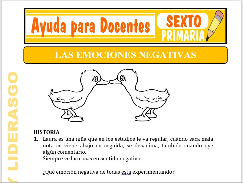 Aquí podrás adquirir fichas de Nuestras Emociones Negativas para Sexto de Primaria o estudiantes que tengan 11 años de edad, esta ficha se ha dedicado y trabajado para el curso de Valores y Liderazgo.